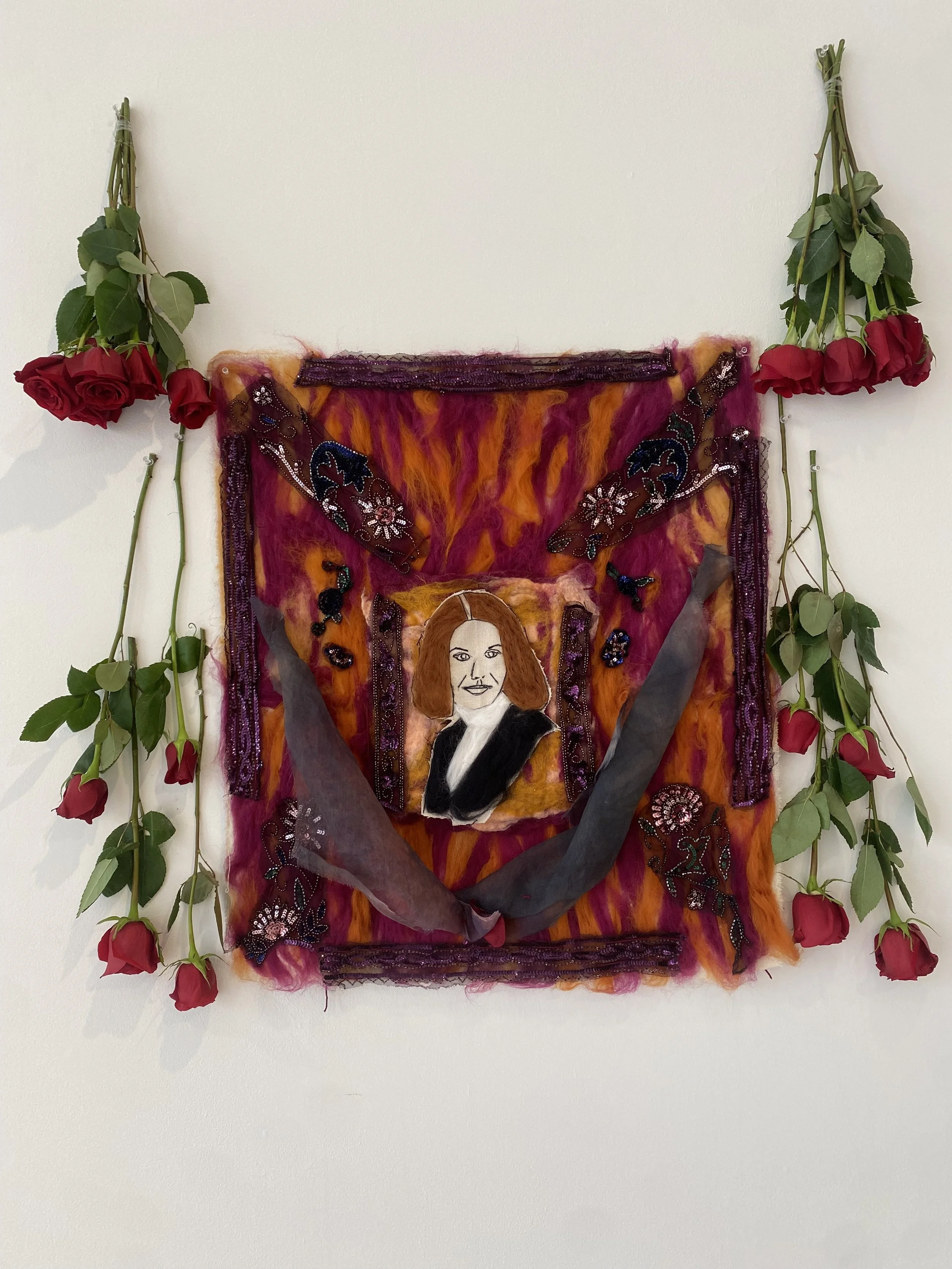 iterations of longing III. wool, yarn, repurposed clothing, sequins, mesh, rope on cloth canvas. installed with red roses. august 2025. alyssa driscoll.