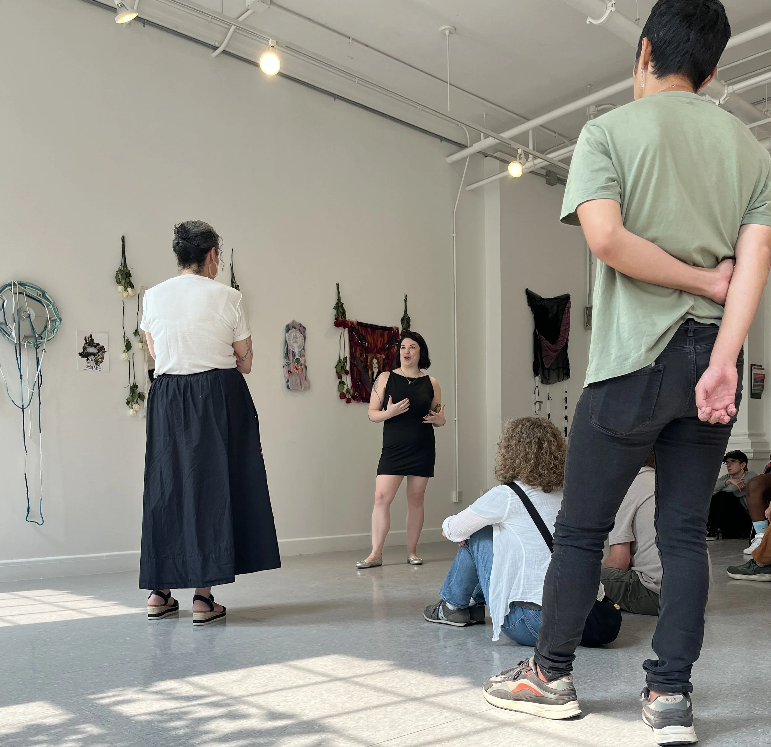 photo shows alyssa presenting her work at her summer 2025 residency review (august 6, 2025) in the brant gallery at massachusetts college of art and design.